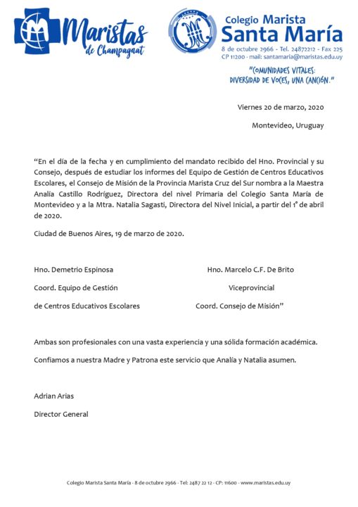 Compartimos el documento oficial comunicando el nombramiento de la nueva dirección de Nivel Inicial y de la dirección de Primaria de nuestro colegio marista Santa María por parte del Consejo de Misión de la Provincia Marista Cruz del Sur.