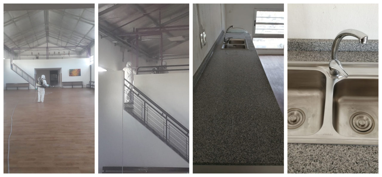 En este caso la instalación de un espacio de cocina en la gran sala multiuso Buena Madre y acciones sanitarias en este espacio también realizadas en el resto del colegio.