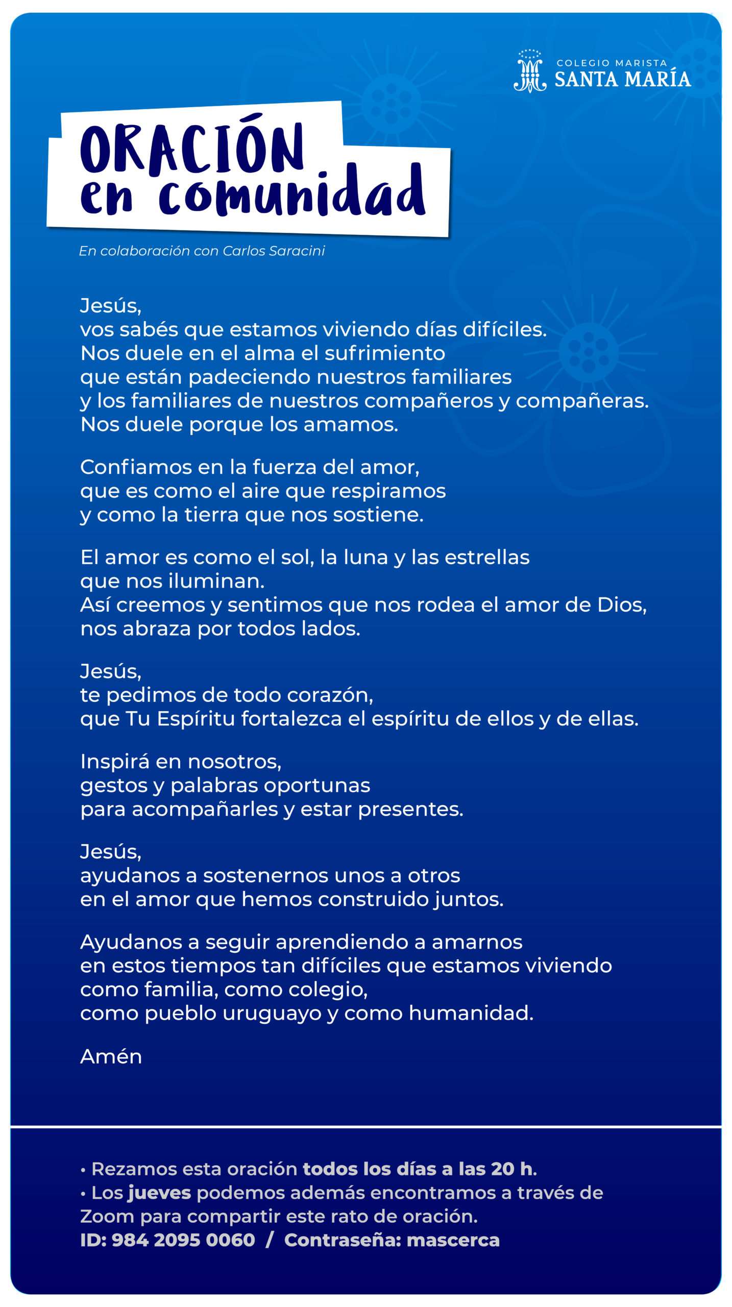 14/04/2021Porque creemos en un Dios que nos envuelve y nos abraza; en un Dios que conoce lo que está en nuestro corazón y nos escucha aunque no encontremos palabras para dirigirnos a Él, les invitamos al encuentro a través de la oración.
