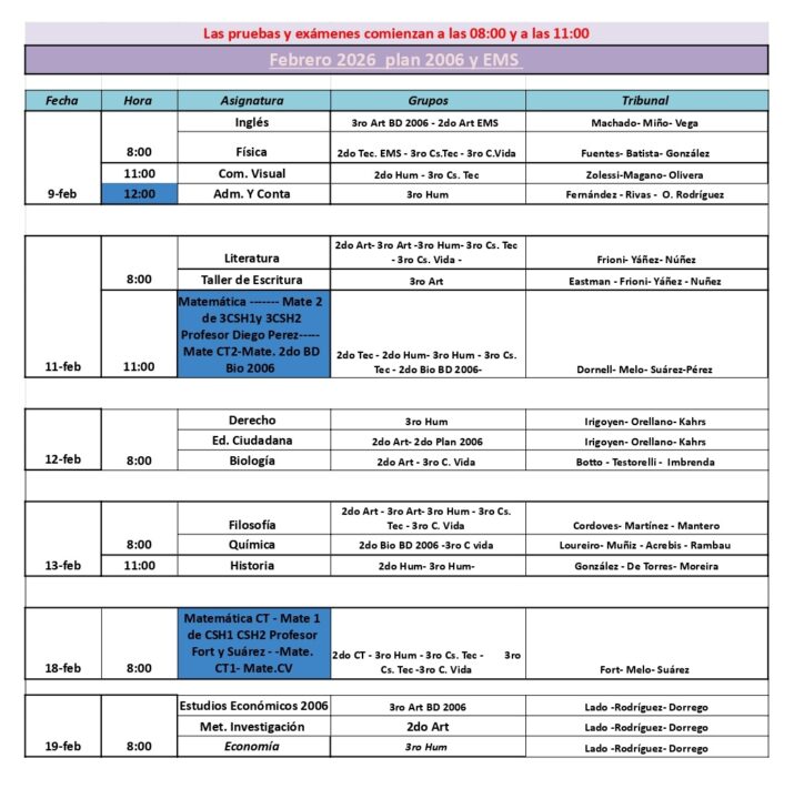 23/12/2025Compartimso con ustedes el calendario de exámenes para el Plan 2006 y las pruebas de EMS para 2° y 3° ciclo.