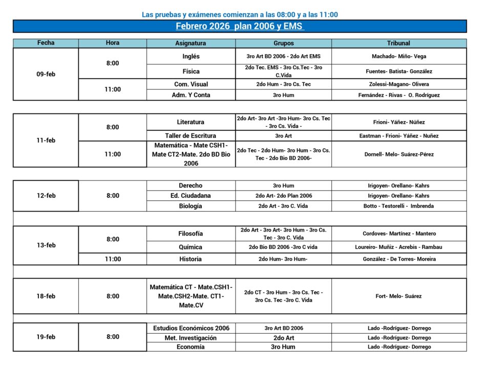 23/12/2025Compartimso con ustedes el calendario de exámenes para el Plan 2006 y las pruebas de EMS para 2° y 3° ciclo.
