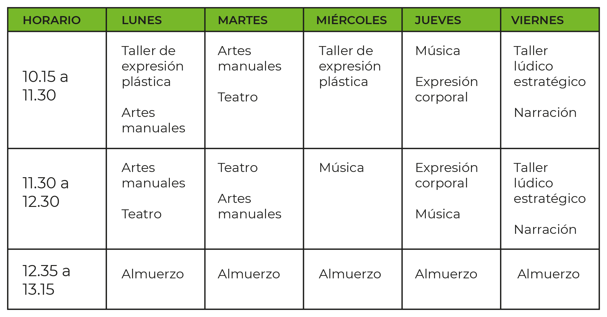 - Todos los talleres son de carácter optativo y rotativo.